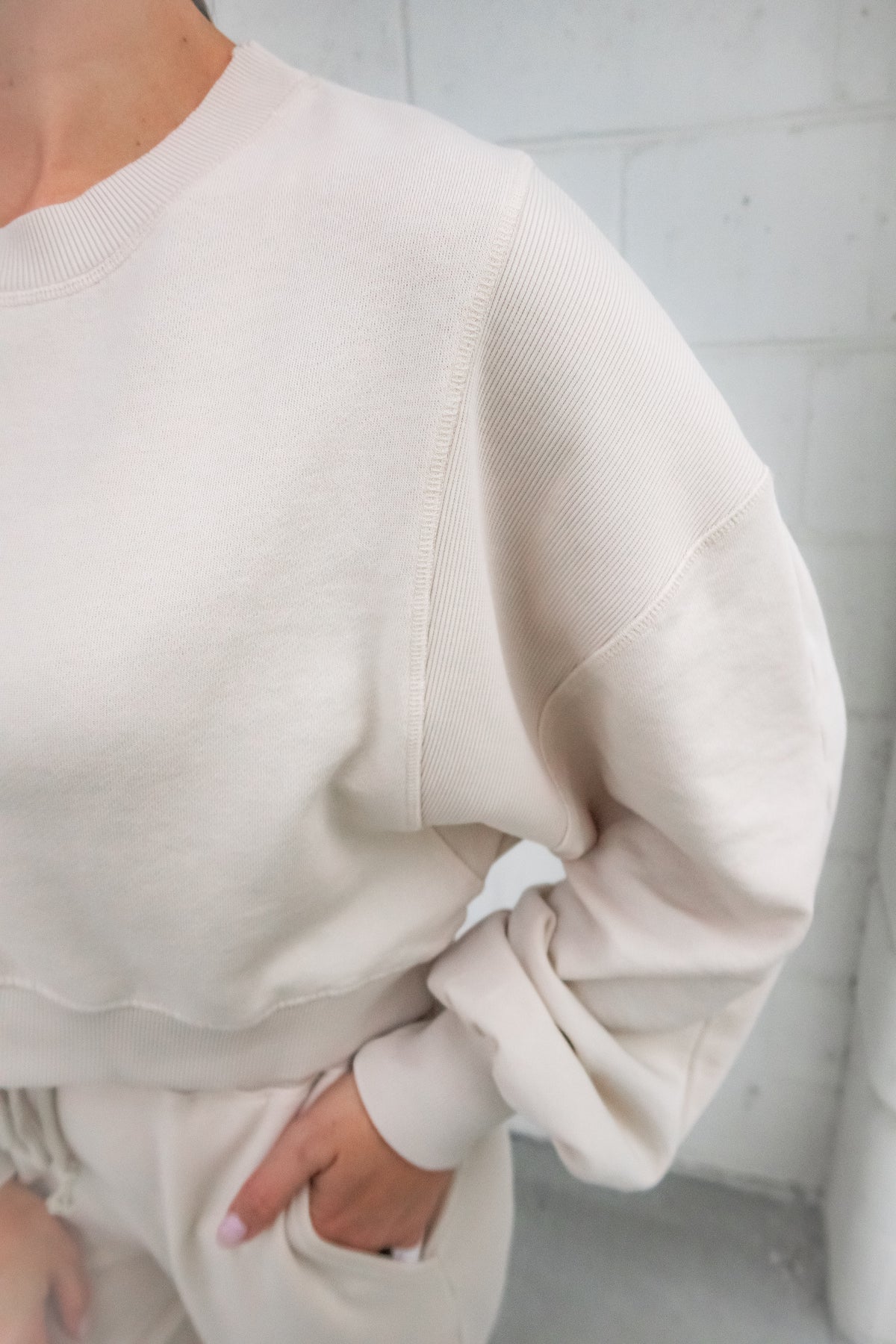 • Top: Stretchy, semi-cropped fit with dolman sleeves and ribbing