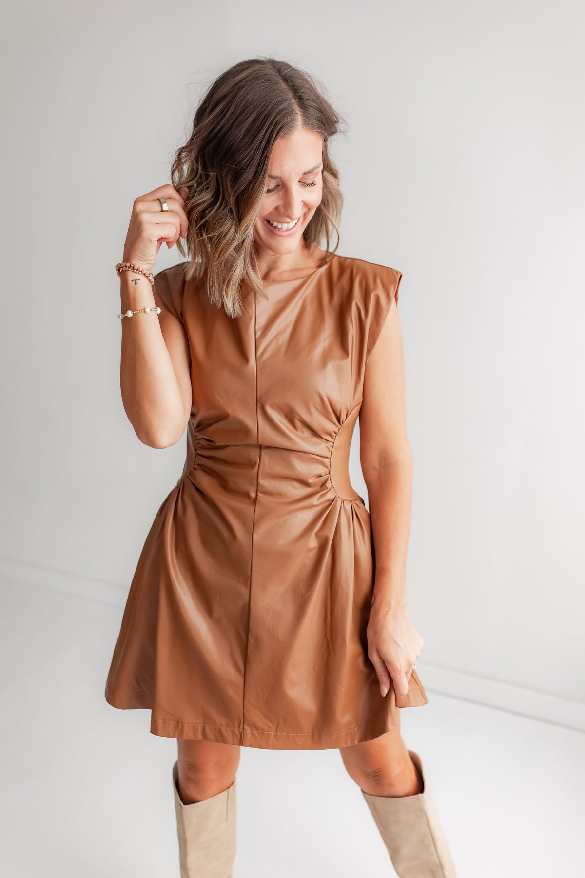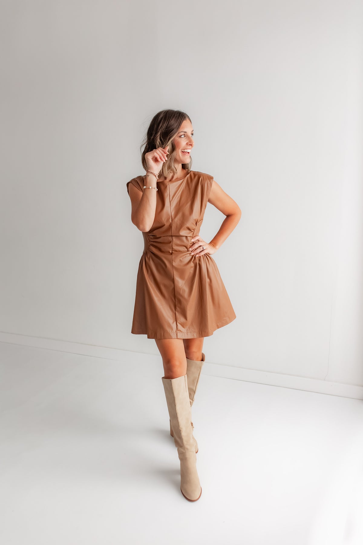 Make a statement in the Hot Shot Dress in a stunning camel leather. This dress is designed to be incredibly flattering, with a sophisticated boatneck and a cinched waist that highlights your figure. The fabric flares beautifully at the hips, creating a chic and elegant silhouette. With a convenient zipper back closure, this is the perfect fall dress to pair with boots for a head-turning look.
