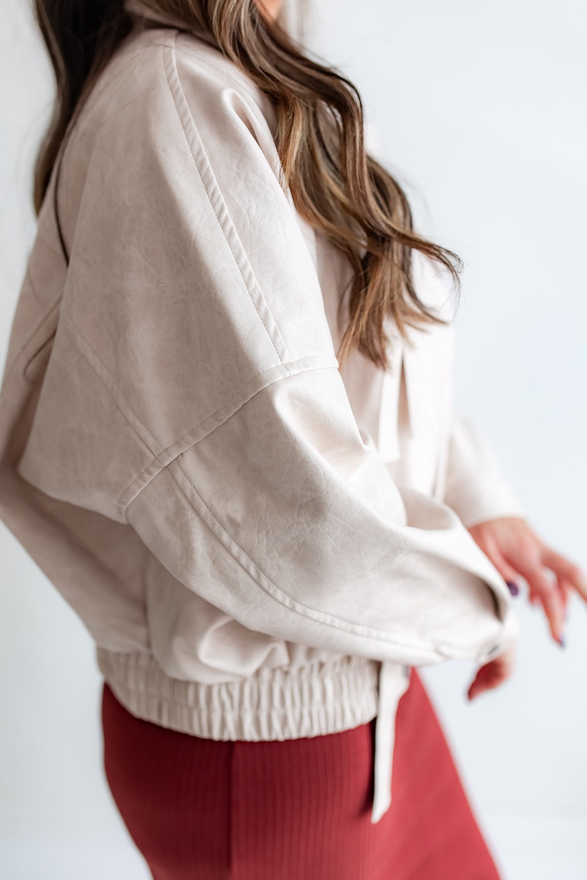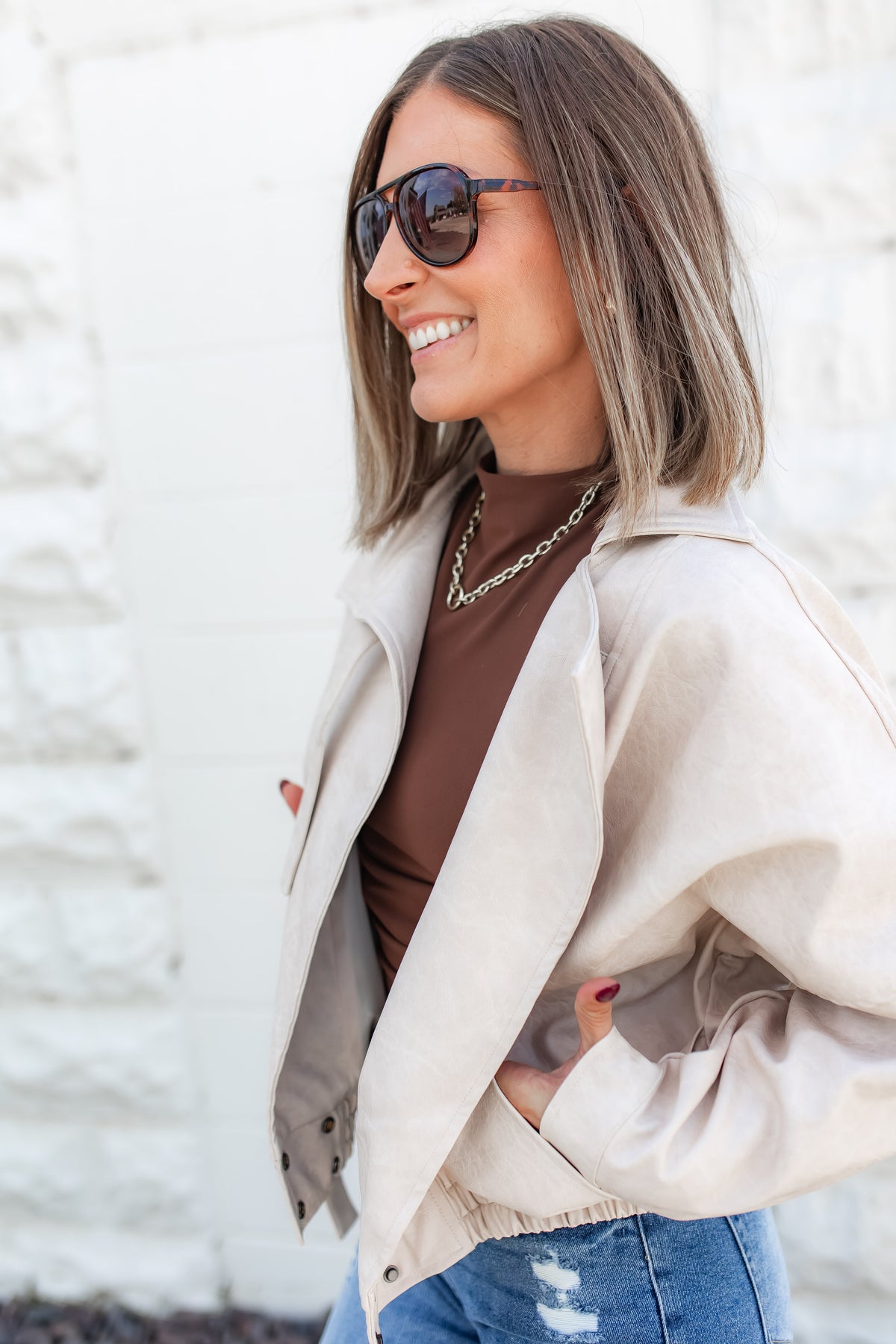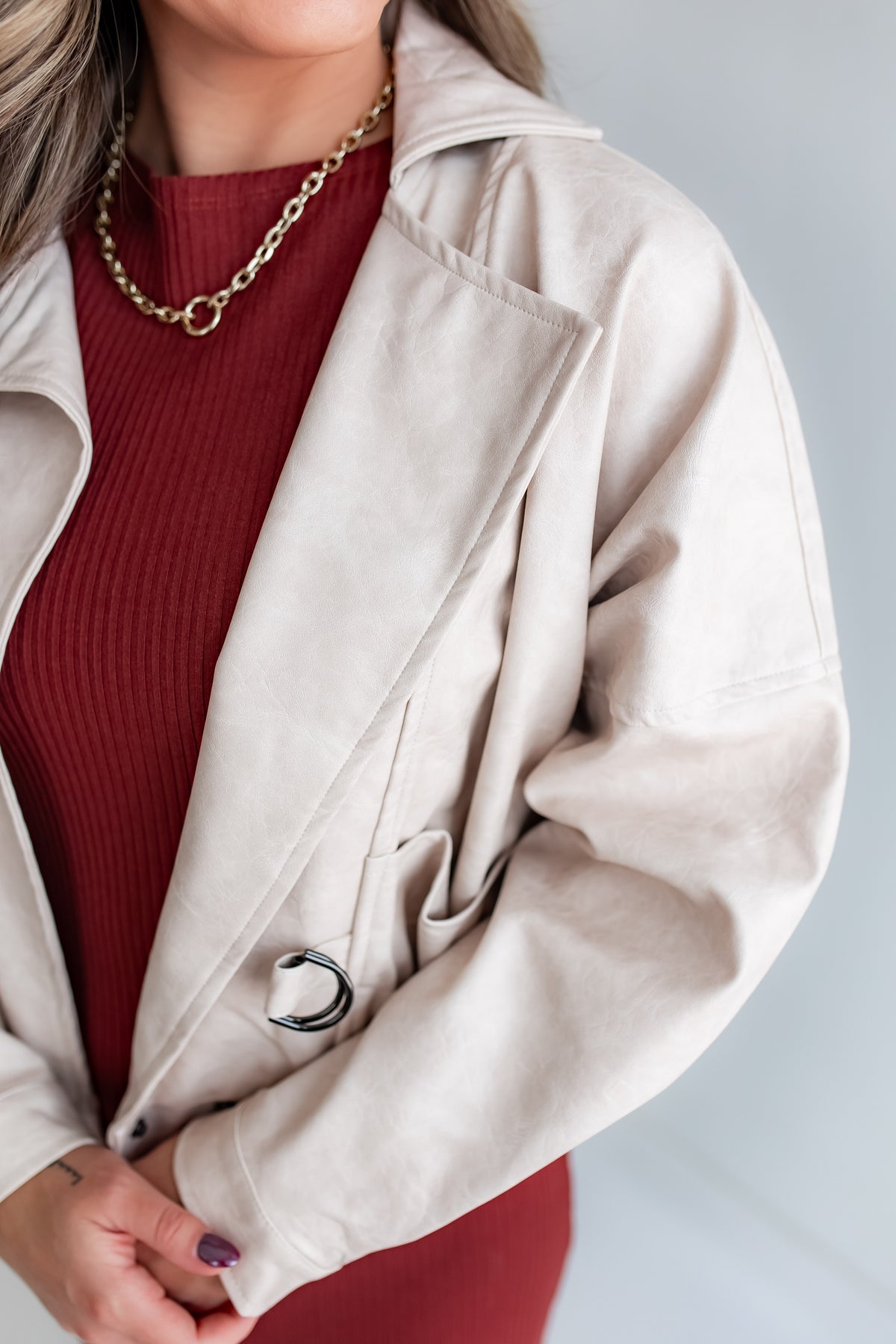 Make a statement with The Bold Move Leather Jacket in the most beautiful cream color. This piece is a truly on-trend style, designed with an oversized and relaxed fit for effortless layering. It features lots of fun details, including ruching elastic at the bottom, zippers, and striking buckle and button accents, making it far from basic.