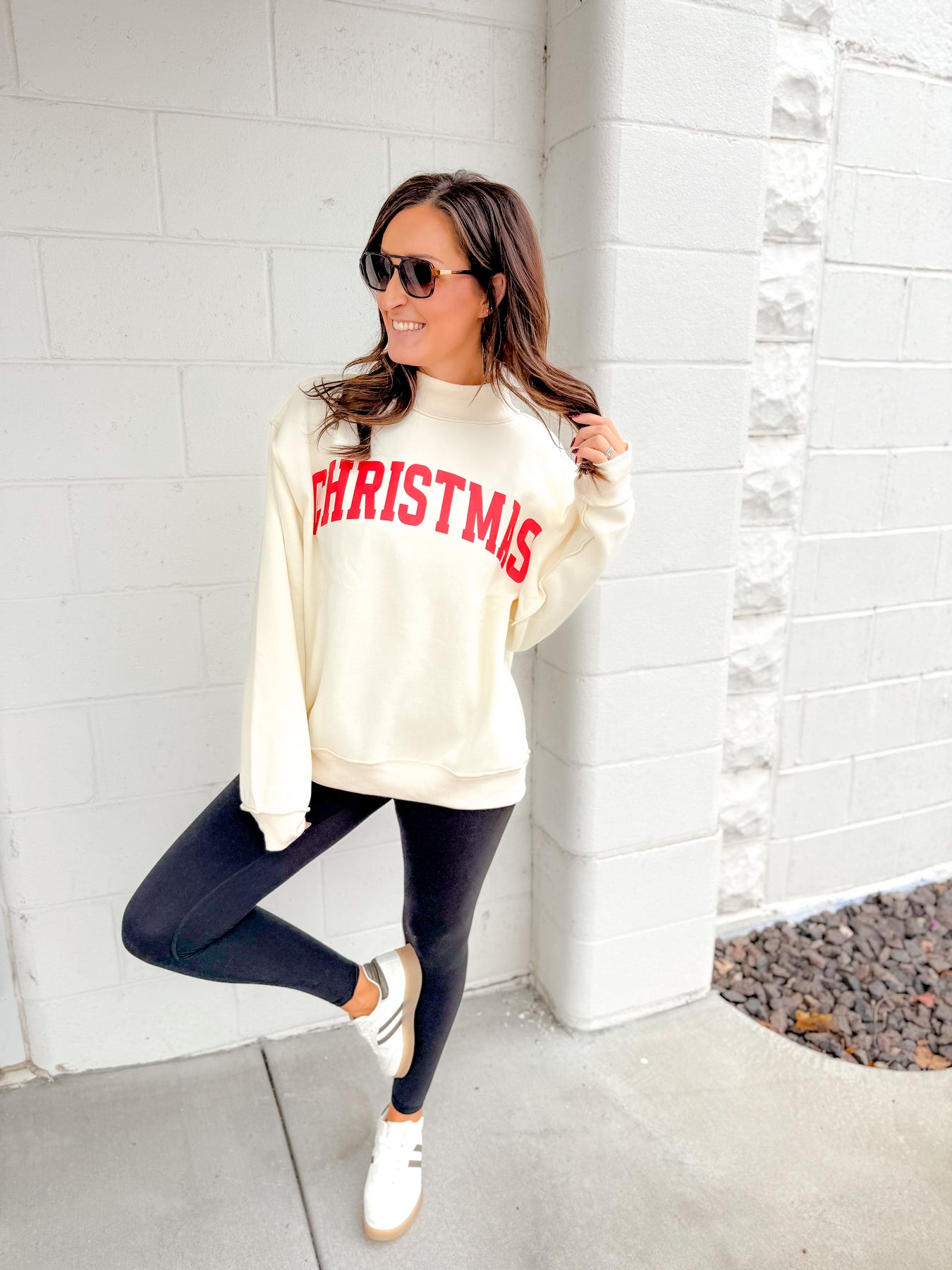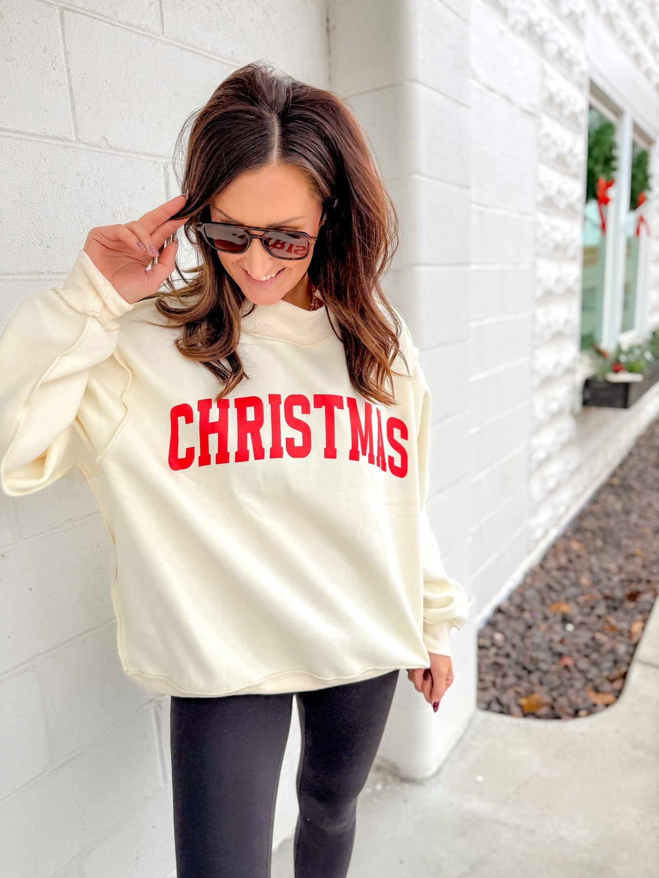 Pair the 'MERRY' side with black leather leggings and sneakers for casual errands. Flip it to the 'Christmas' side and wear it with the Eloise Plaid Skirt and tights for a fun holiday movie marathon.