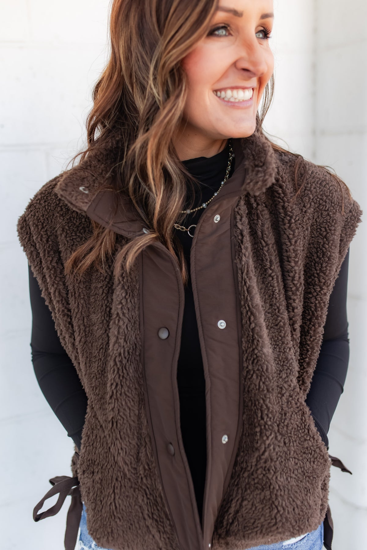 Stay cozy in style with The Snowfall Sherpa Vest in classic Brown. This vest is made from plush sherpa fabric and features a relaxed fit, a classic collar, and button closures. The unique adjustable bottom with a bow detail allows you to customize the fit and add a feminine touch.