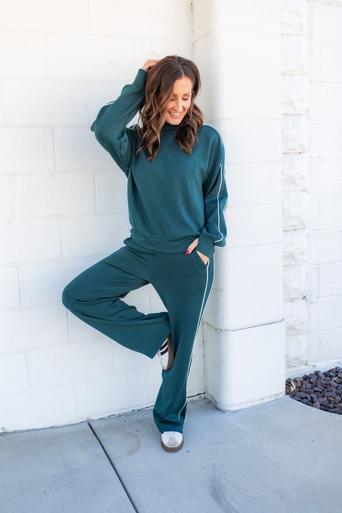 Complete your athletic set with The Sundown Scuba Piping Pullover. This pullover features a comfortable mockneck and is made from the same structured, smooth green scuba material with crisp white piping accents. It's the perfect combination of sporty style and cozy comfort.