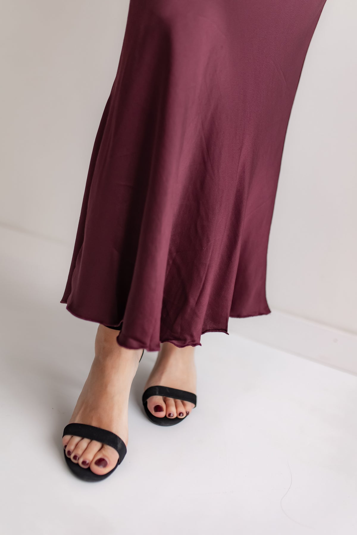 The Satin Holiday Midi Skirt is designed for festive elegance. This skirt features a beautiful tulip style cut in the prettiest burgundy color for the season. The comfortable elastic waist is delicately finished with a touch of lace trim, adding a final, luxurious detail.