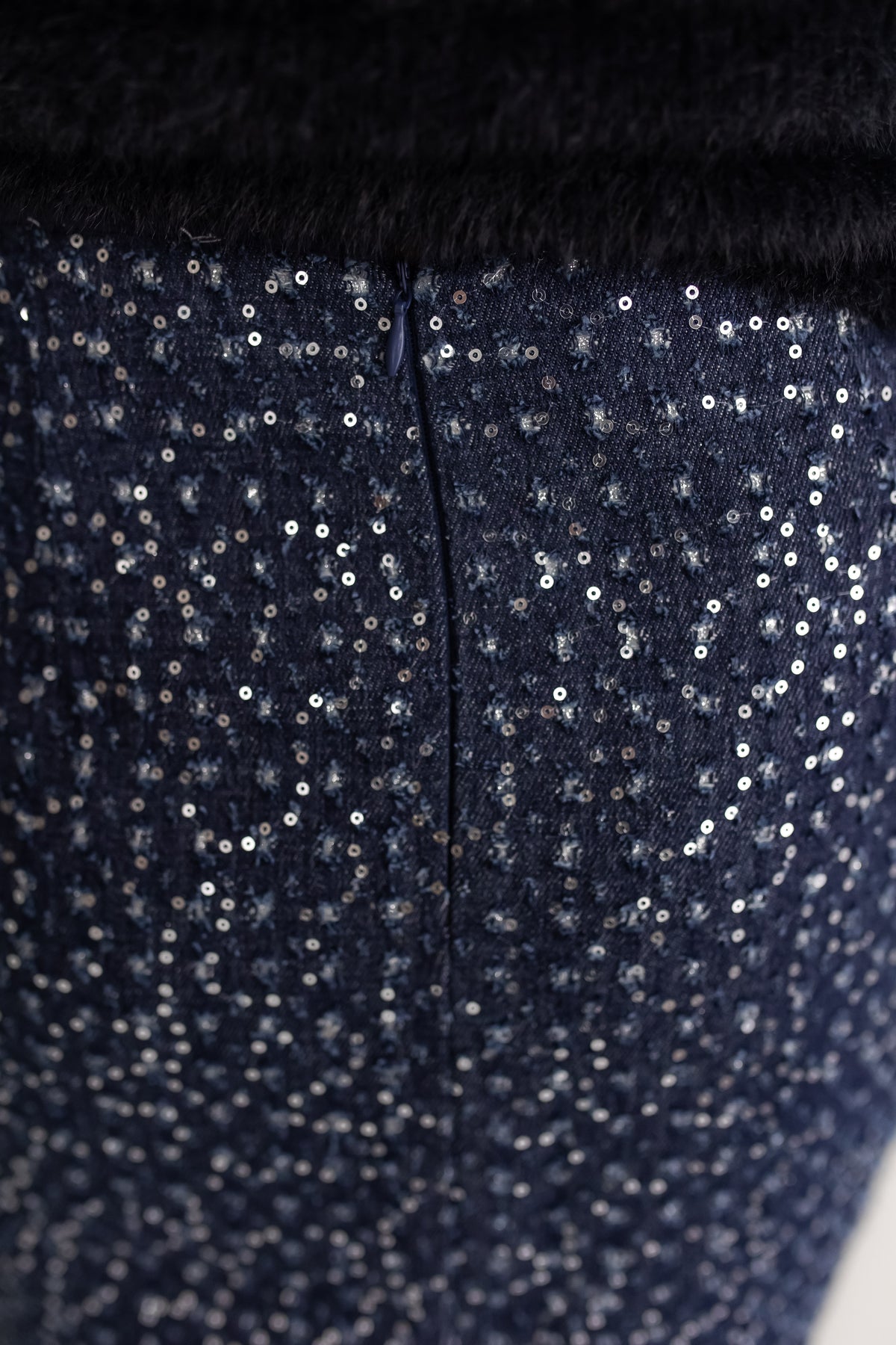 Add instant sparkle to your look with The Light The Night Skirt. This festive mini skirt features gorgeous navy blue sequins on a stretchy denim-like base. It is designed for a comfortable fit with a secure zipper back.