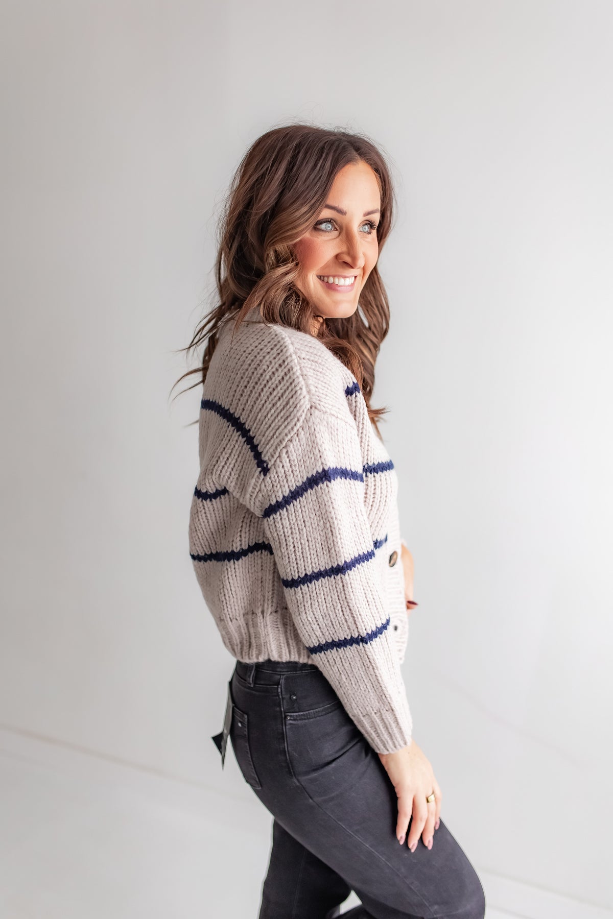 A modern take on a classic stripe cardigan sweater top is detailed with shell and navy combination for a subtle contrast. Soft, cozy, and easy to style, it’s the perfect layer for crisp days and casual nights alike.