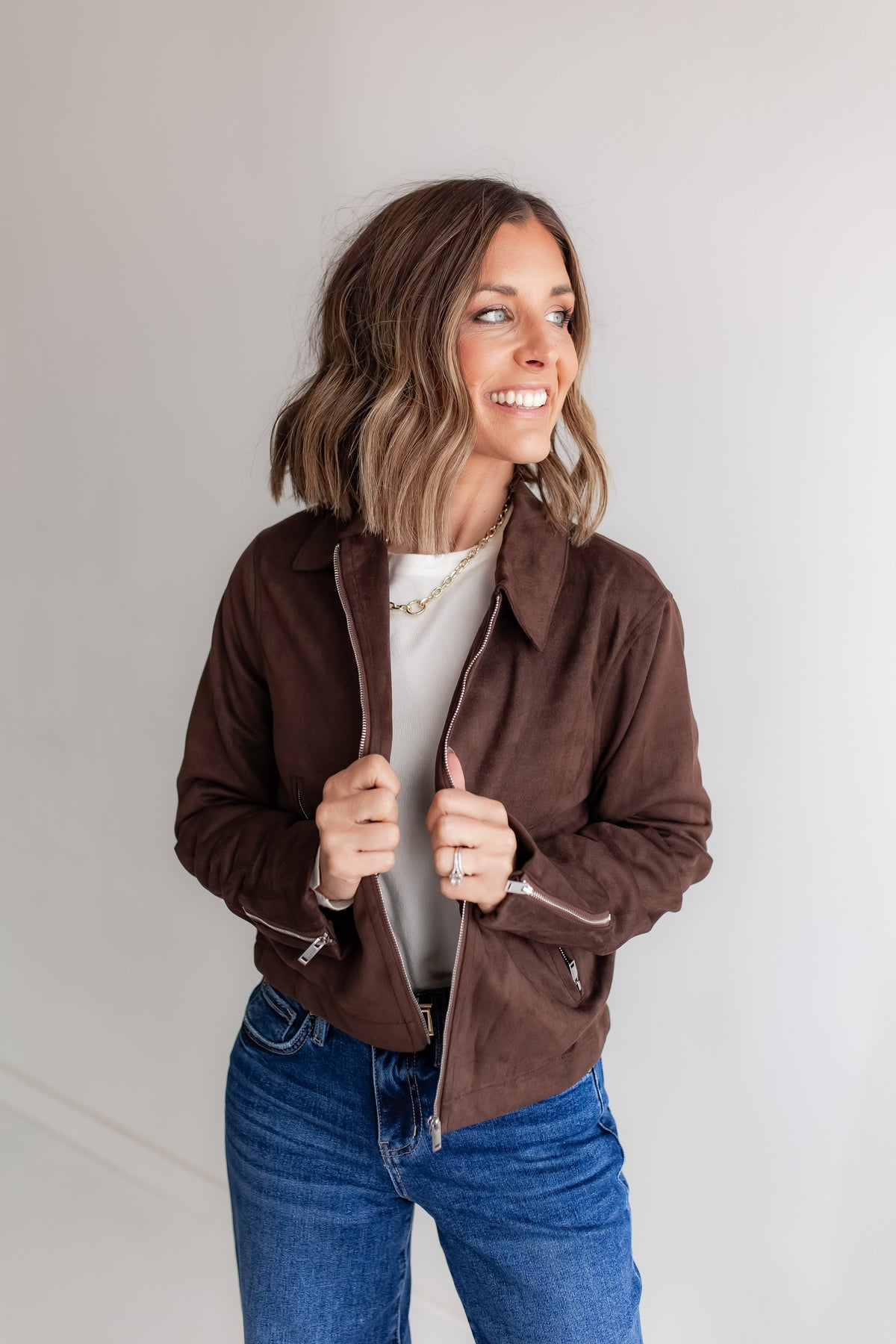 Wrap yourself in autumnal elegance with the Cafe Suede Jacket. This jacket is crafted from a soft, high-quality suede-like fabric in the prettiest chocolate color. It features classic silver zipper details and a stylish collar. As a lightweight fall jacket, it's the perfect layering piece for those crisp days, adding a touch of polished style to any outfit.