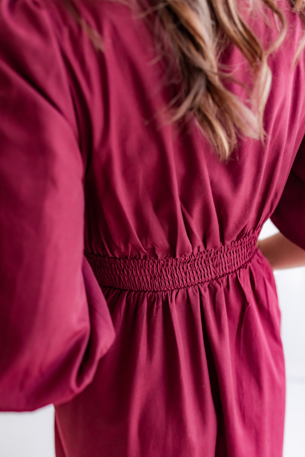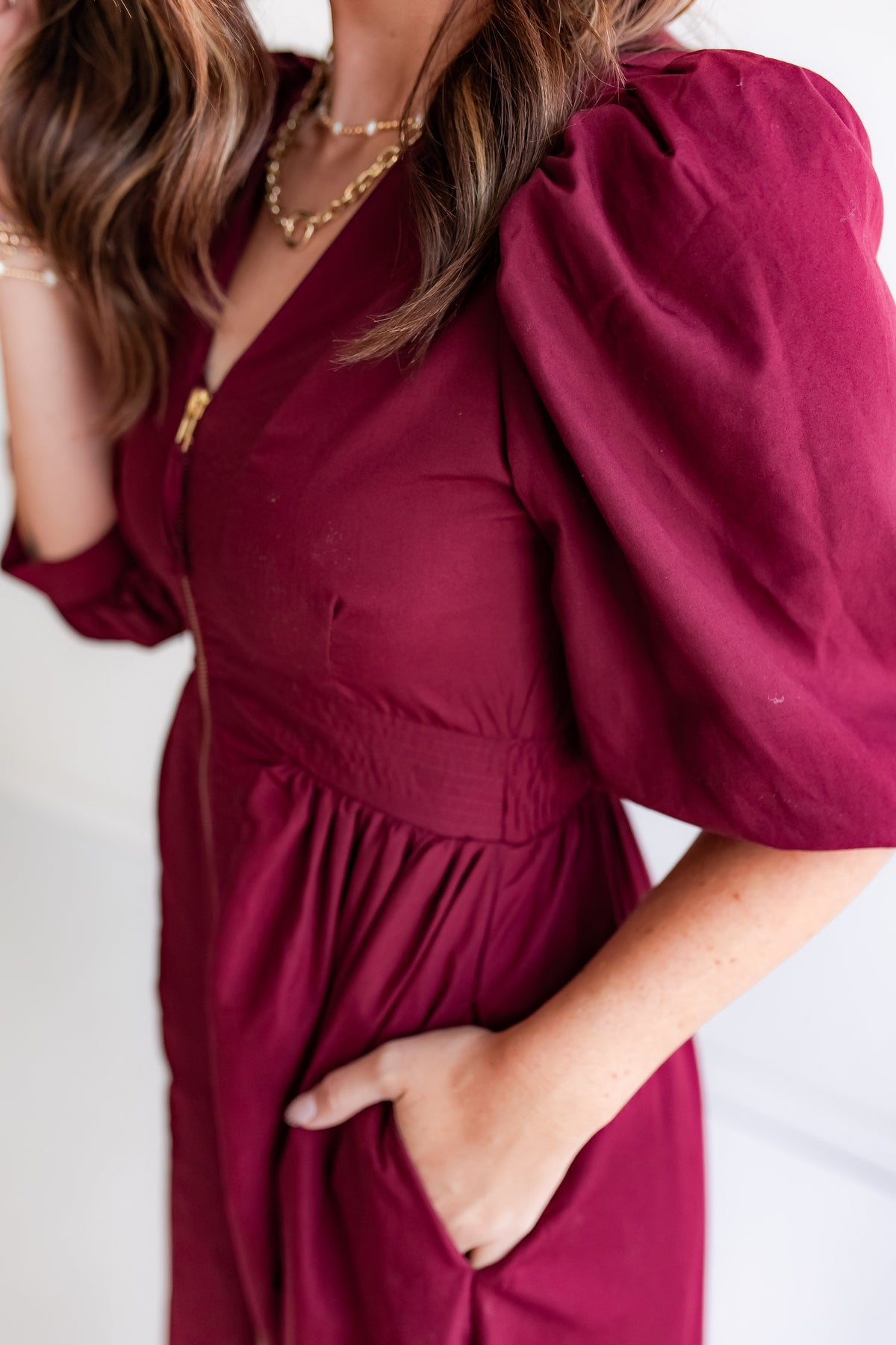 Command attention in The Stolen Glances Midi Dress. This stunning dress in a gorgeous wine color is designed with romantic puff sleeves and a flattering V-neck. The cinched waist creates an hourglass shape, while a discreet zipper front and functional pockets add practical elegance. This is the prettiest dress for fall events.